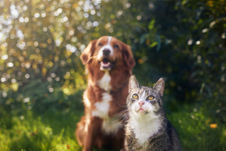 Cat and dog sitting together in grass on sunny day. Freindship between tabby domestic cat and Nova Scotia Duck Tolling Retriever.