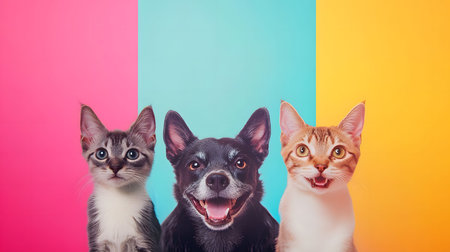 A cheerful black dog and two expressive cats pose against a bright, color-blocked background in pink, blue, and yellow. The playful expressions and vibrant setting create a joyful and modern visual perfect for pet-themed content AI Generative