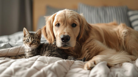 Golden retriever and silver tabby cat posing together with joyful expressions