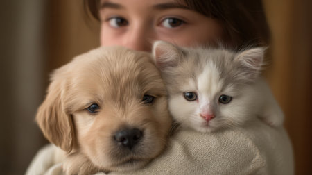 A heartwarming scene featuring a young child holding a fluffy puppy and a curious kitten, showcasing the beautiful bond between pets and family in a cozy environment.