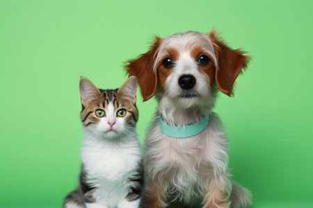 Cute friends cat and dog isolated on green plain background, veterinary clinic concept