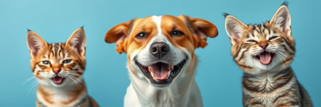 Three pets, a dog and two cats, all smiling broadly, are positioned against a solid blue backdrop