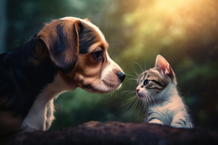 A heartwarming scene of a puppy and kitten cuddling together, showcasing the bonds of friendship and affection in the animal world, captured in a tranquil moment.