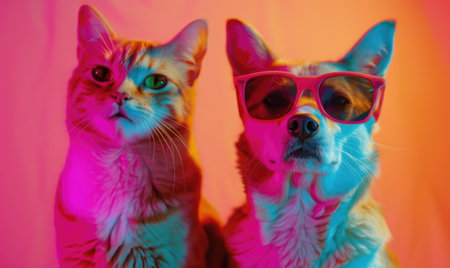 Portrait of a cat and a dog with sunglasses on a colored background