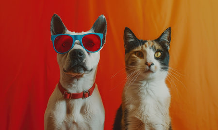 Cat and dog wearing red sunglasses on orange background. Concept of friendship.