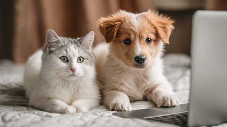 Adorable puppy and fluffy cat sitting side by side on a cozy bed while interacting with a laptop, showcasing companionship and playfulness indoors