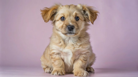 Adorable golden puppy sitting on pink background.