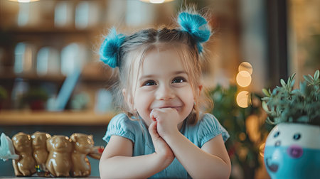 A cheerful young girl with braided hair and colorful accessories, dressed in a cozy yellow sweater, radiates happiness in a softly lit indoor setting