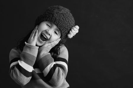 Cute baby girl in a warm hat on a yellow background.