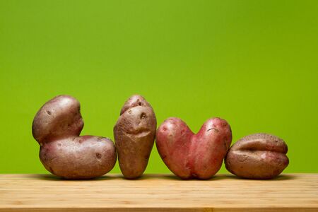 Ugly vegetables on a green background. Funny concept for vegetarians. Pop Art. The word LIVE is made up of deformed potatoes. Horizontal orientation. Copy space.