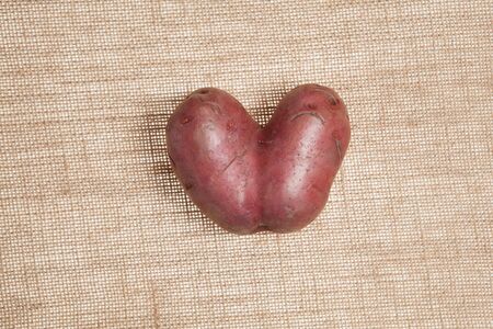 One funny heart-shaped potato on burlap background. Closeup. Ugly vegetables.