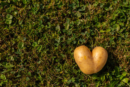 A heart-shaped potato sits on lush green grass, showcasing an unusual shape that adds charm to the garden scene. This unique vegetable stands out in its natural setting