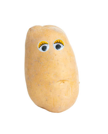 Hand holding potato smiley with Googly eyes. Food with funny face on white background.