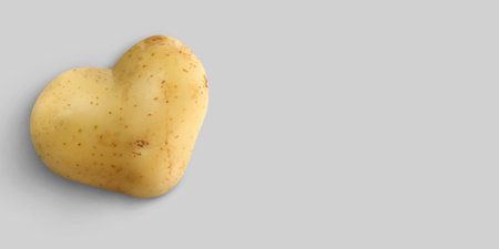Heart shaped potato on gray background, top view. Banner design with space for text