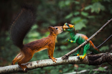 A red squirrel takes food from a toy dinosaur in the forest.