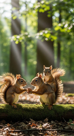 Three adorable squirrels playing together in a sunlit forest surrounded by lush greenery and ferns