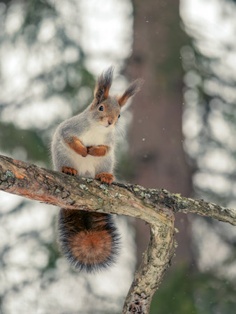 Squirrel sitting on a tree branch in a winter forest and looking at the camera