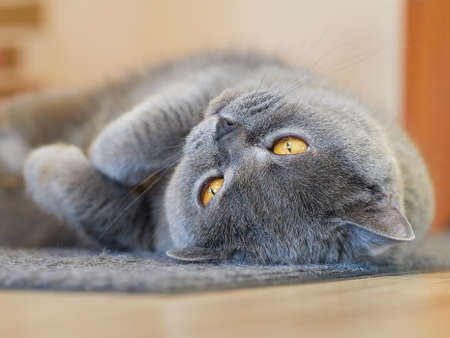 Portrait of lying gray cat with orange eyes close-up. British blue Shorthair cat. Selective focus