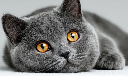 Adorable grey british shorthair cat with striking orange eyes resting on a white surface