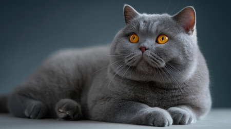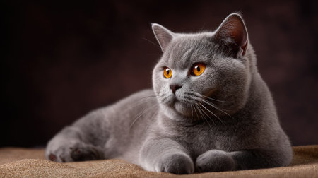 A grey cat lounges comfortably, showcasing its captivating amber eyes and soft fur texture. The serene expression and gentle lighting create a peaceful atmosphere, making this image perfect for pet lovers and animal enthusiasts.