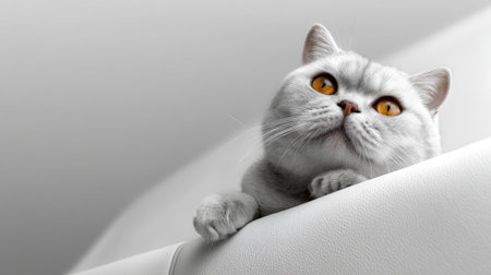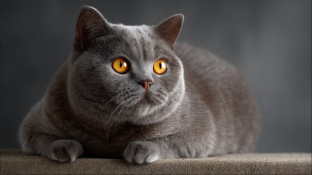 This captivating image features a British Shorthair cat with stunning orange eyes, gazing thoughtfully against a soft, minimalist backdrop. Its elegance and charm are evident.