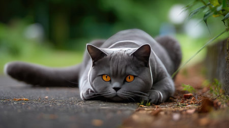A captivating grey cat with vivid orange eyes rests comfortably on a pathway, surrounded by a lush green backdrop, capturing a serene and peaceful moment in nature.