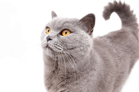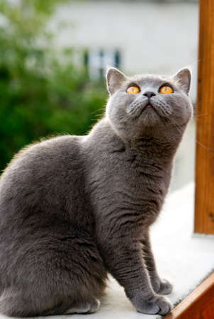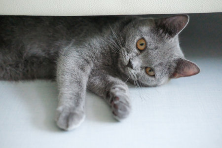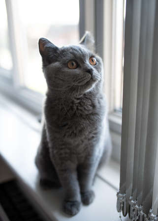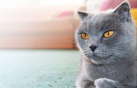 British shorthair cat. A beautiful domestic cat is resting in a light blue room, a gray Shorthair cat with yellow eyes looking at the camera.