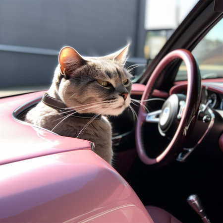 A cat is sitting in a pink car with the steering wheel open Generative AI Generated