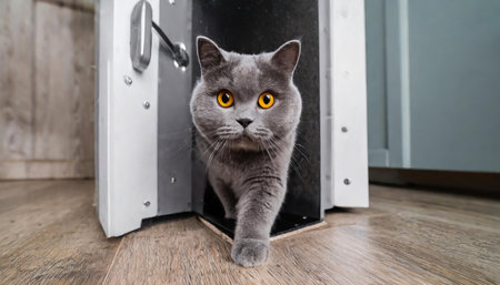 Serious British Shorthair Cat Sitting Outdoors, confident looking forward attentively. Gray british shorthair cat sits calmly on paved surface inside. Pet cats concept. Copy ad text space poster
