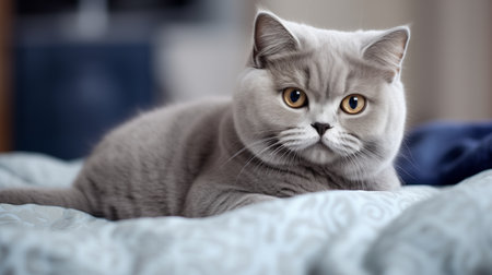 Beautiful gray Scottish domestic cat is resting in a light room, close-up on a blurred background. Copy space for an inscription.