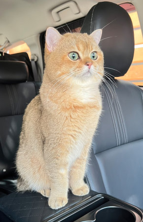 A fluffy orange cat sits gracefully on a car seat, displaying big green eyes and a curious demeanor. This adorable pet showcases a loving companion spirit.