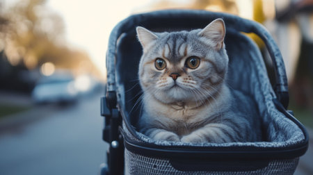 A Scottish Fold cat sitting comfortably in a pet stroller while its owner pushes it along a quiet suburban street.