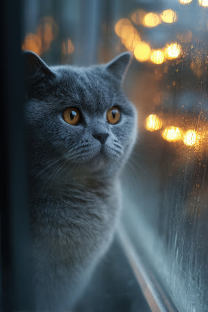 A British Shorthair cat looks through a frosted window, captivated by the warm glow of fairy lights inside. The cozy ambiance highlights the cat's curious expression.