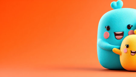Two stylized cartoon characters are featured against an orange background. The characters, a larger teal figure and a smaller yellow one, display cheerful expressions. The composition uses soft lighting and a minimalist style. Suitable for diverse applications, it offers copy space for messaging and other editorial uses.
