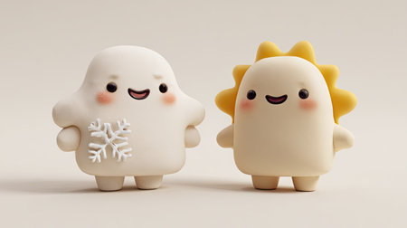 Two stylized, cartoon-like figures, one with a snowflake design and the other with a yellow sunburst. Both figures are cream colored with cheerful expressions and are standing upright on a plain, light beige background.