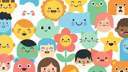 A colorful illustration features numerous cartoon characters and objects, each with a cheerful expression. The style is flat, with simple shapes and bright colors. Composition is densely packed, suggesting a playful, imaginative world. Suitable for various creative projects, including children's books, educational materials, and decorative designs.