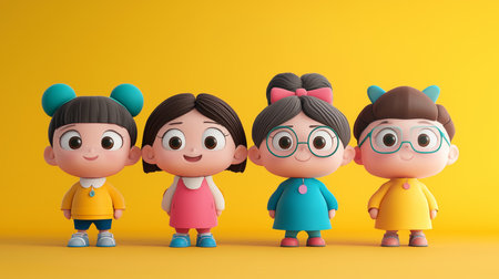 Four cartoon children stand together in bright colors against a yellow background, showcasing cheerful expressions and playful attire