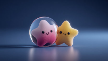 Two charming, cartoon-style stars are depicted in a soft rendering. One is inside a transparent bubble, the other is free. The stars are colored in pink and yellow hues, against a smooth blue gradient. The image, with its cheerful design, could be suitable for various creative and commercial applications.