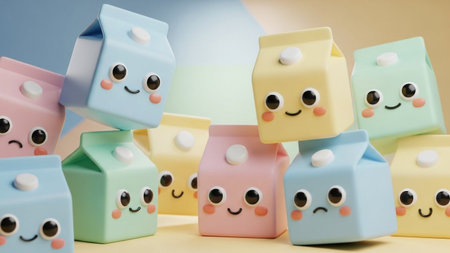 A collection of adorable, pastel-colored gift boxes designed to look like milk cartons with happy cartoon faces, perfect for party favors.