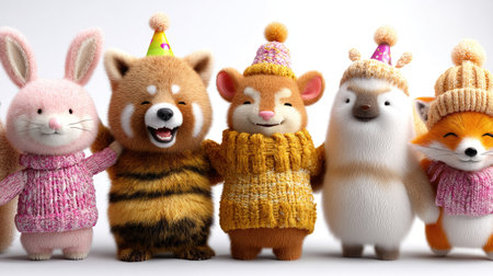 This delightful image showcases a group of adorable cartoon animals, including a rabbit, a fox, and a bear, wearing colorful party hats and cozy sweaters. The cheerful expressions reflect a joyful celebration, making it perfect for seasonal themes and festive projects.