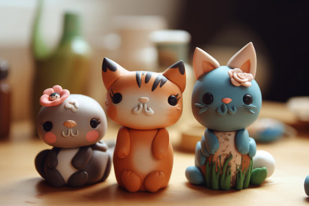 Trio of colorful, cute cat statuettes with flower decorations on a wooden table
