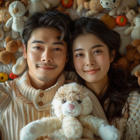 A cute kawaii plush toy characters with heart shapes floating above them in colorful soft environment full of warmth and joy