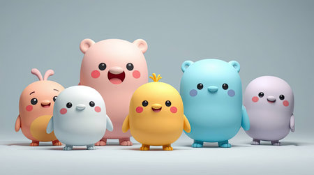 A delightful scene featuring cute, colorful cartoon characters surrounded by bubbles in a soft blue background. This whimsical image exudes joy and warmth.