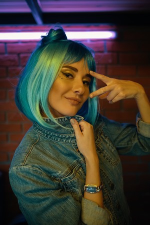 Close up portrait of millennial pretty korean woman with long hairstyle with neon light. Hipster teenager in studio