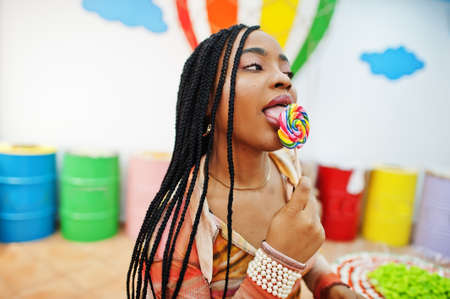 African american millennial lady at candy shop with lolipops.