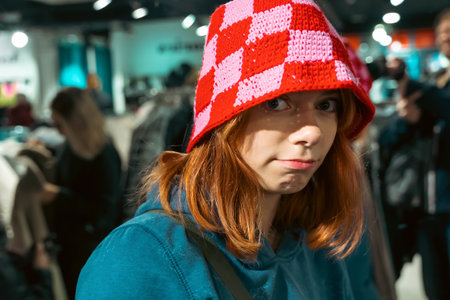 Close-up portrait of an adorable red-haired teenage girl wearing a funny red knitted hat, with a joyful expression, creating a cute and playful atmosphere during the winter season.