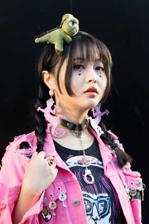 LONDON, ENGLAND - September 15, 2019 Stylish attendees gathering outside 180 Strand for London Fashion Week. Chinese girl dressed in decora japanese street style in a pink denim jacket with toy dinosaur instead of a hairpin on her head
