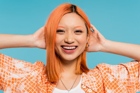 positivity, radiant smile, young asian woman with dyed hair standing in orange shirt and smiling on blue background, casual attire, freedom, cheerful attitude, looking at camera