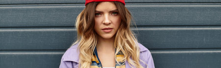 Panoramic banner, portrait of young confident hipster guy wearing denim jacket, round glasses and cap, isolated on background of lush lava color with copy space.