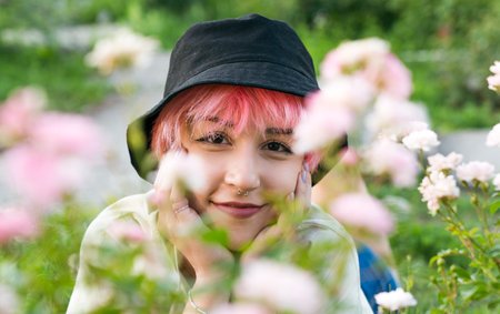 Smiling girl with pink hair